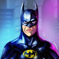 the bat emblem on his chest. The background suggests a nighttime