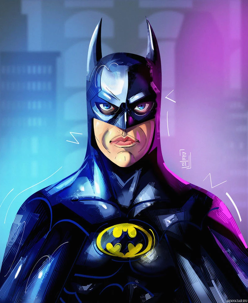 The image depicts a stylized illustration of Batman, the iconic comic