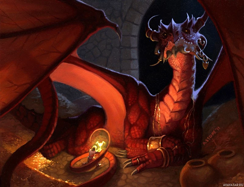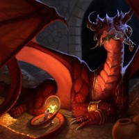 various objects that could be treasures or magical items, including what looks like a ring and possibly a jewel. The dragon is detailed with scales, claws, and other typical characteristics of mythological or