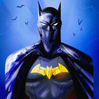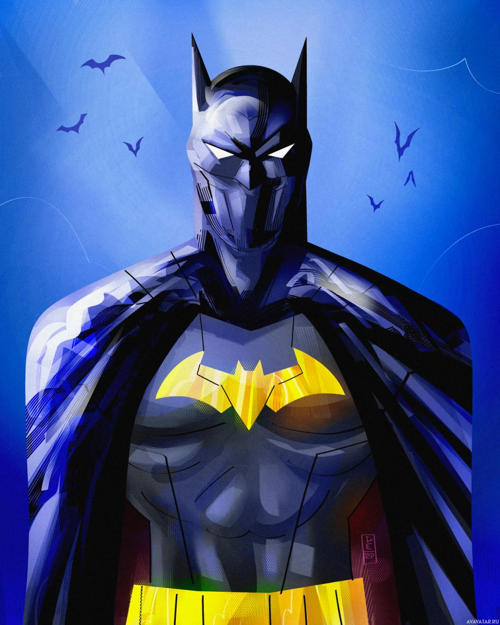 The image features an illustration of a character known as Batman. Batman is depicted in his