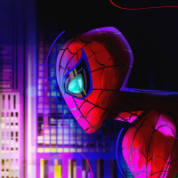 web patterns on it is clearly visible. Spider-Man's hands are clenched into fists, suggesting he might be ready for action or prepared to swing his webs. The style of the image is reminiscent of comic book artwork, giving a sense of dynamic movement and intensity typical of Spider-Man's adventures in