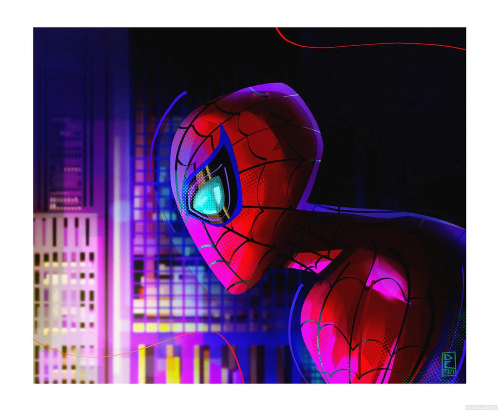 The image depicts an illustration of Spider-Man. He is standing in a dark