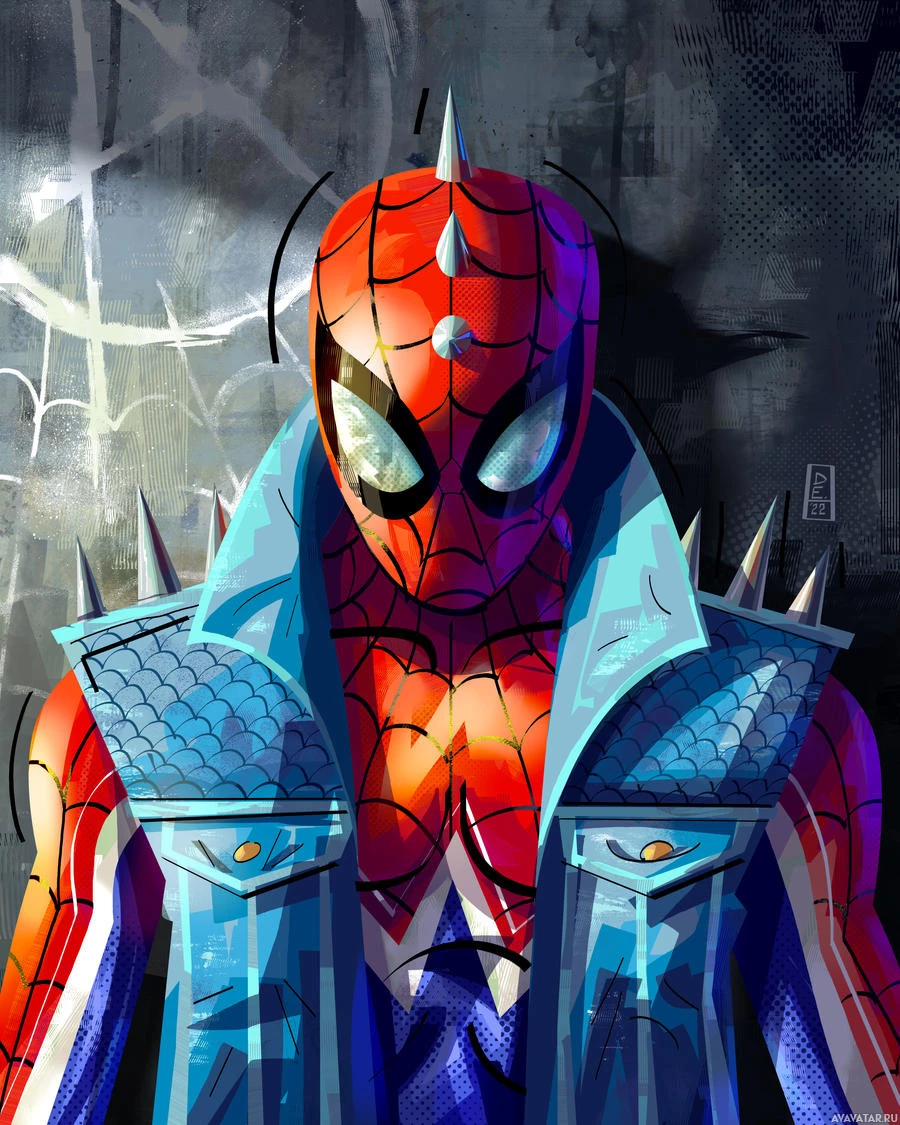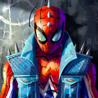 an illustrated character that resembles Spider-Man, a popular comic book hero. This depiction has a modern and somewhat stylized look with additional elements such as a vest with spikes or thorns on it. It is a digital artwork rather than a photograph of