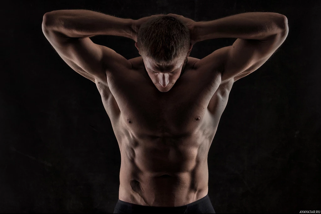 a man in the foreground who appears to be flexing his muscles. He is shirtless, showing off his well-