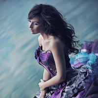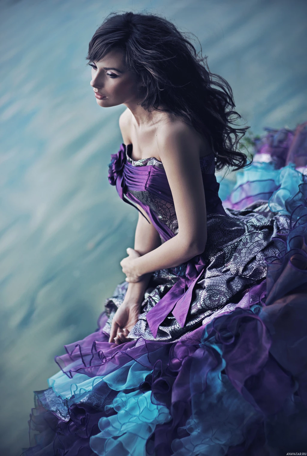 a young woman with dark hair, dressed in a formal purple ball gown. She is seated on the edge of what appears to be