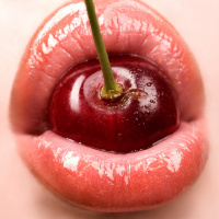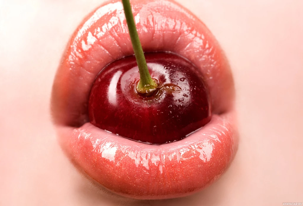 На картинке крупным планом изображены губы, между которыми находится что-то похожее на вишню или ягоду. Губы красные, а плод имеет зеленую плодоножку. На губах и фрукте также присутствует какое-то вещество, которое можно интерпретировать как блеск или конденсат.