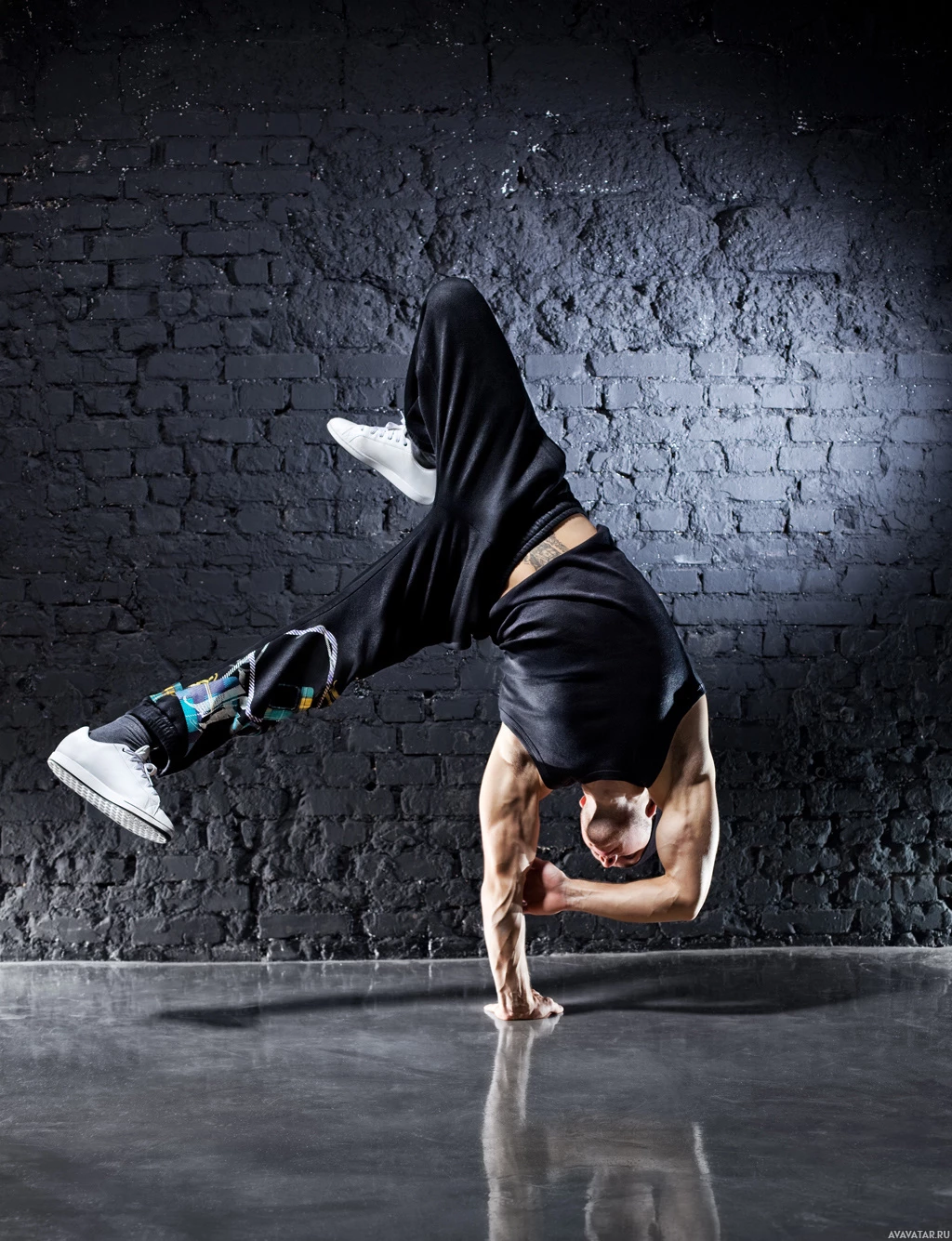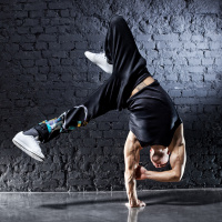 На картинке изображен мужчина, выполняющий акробатические танцевальные движения, когда он балансирует на одной руке, опираясь на кирпичную стену. Кажется, что он находится в движении, что позволяет предположить, что снимок был сделан во время выступления или тренировки по современному танцу или акробатике.