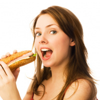 На картинке изображена женщина, которая ест бутерброд, скорее всего, с салатом из тунца, учитывая видимые ингредиенты. Откусывая от бутерброда, она делает удивленное или восхищенное выражение лица.