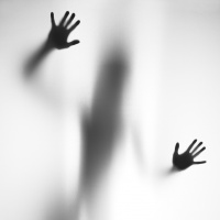 The image appears to depict a hand reaching out towards what looks like a silhouette of a person. It's a monochromatic photograph with an artistic quality, possibly intended to evoke a sense of interaction or communication between the two figures.