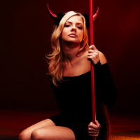 The image shows a woman posing for the camera with a devil-themed prop. She has