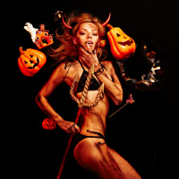 devil horns on her head and is holding a broomstick with a witch's hat on top of it. There are also pumpkins scattered around the scene, which adds to the festive Halloween theme. The woman appears to be in motion, possibly dancing or performing, and there's a demonic element to her costume, suggesting that she might be portraying a character related to the devil or witchcraft.