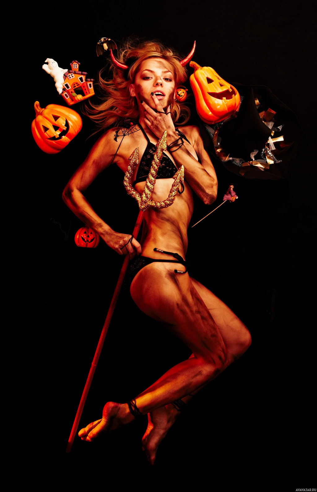 The image features a woman dressed in lingerie, with a Halloween-themed setting. She has painted