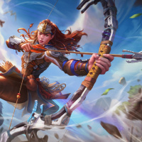 the video game "Horizon Zero Dawn." This character is depicted as an archer, equipped with a bow and arrow. She appears to be in action, possibly during combat or while exploring her environment. Her pose suggests movement, indicating that she might be on the run or dodging a threat. The graphics are vibrant and detailed, capturing the essence of the game's art style and setting.