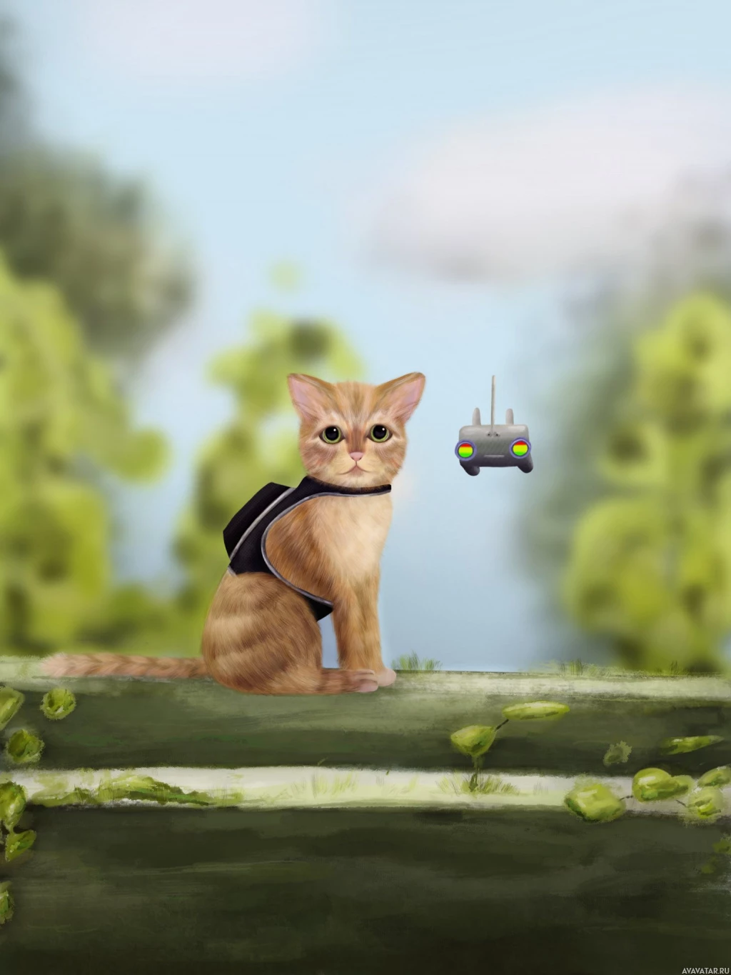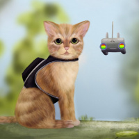 The image features a cat sitting on the ground, wearing what appears to be a backpack. Behind the cat is an illustration of a robot or some type of alien-like figure with