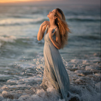 a young woman in a flowing dress, standing on a beach at what appears to be either sunrise or sunset given the warm hues in the sky. She has her arms raised and is looking upwards towards the sky, which creates