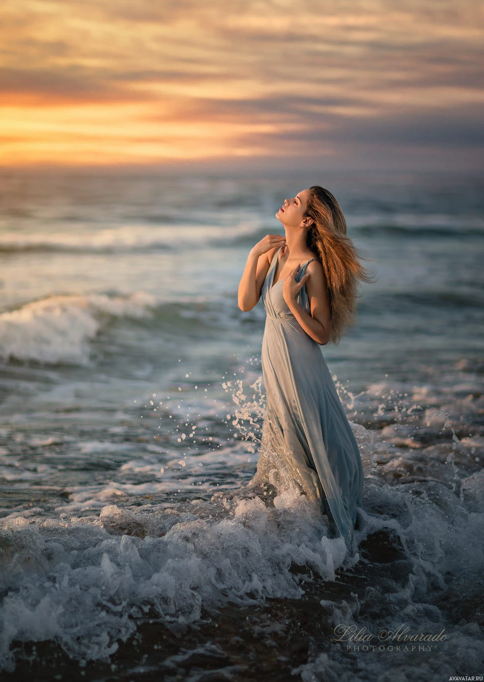an ethereal atmosphere. The waves gently reach her feet, adding to