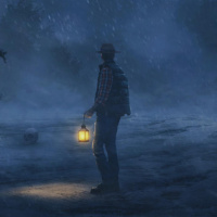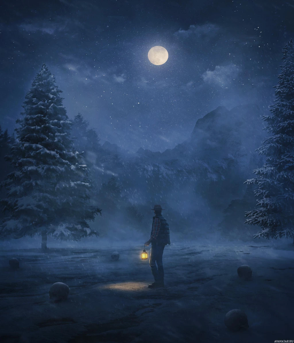 a snowy landscape at night. The person appears to be wearing a hat and holding a lantern, which suggests they might be engaged in an activity such as searching or exploring. There are snow-