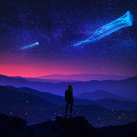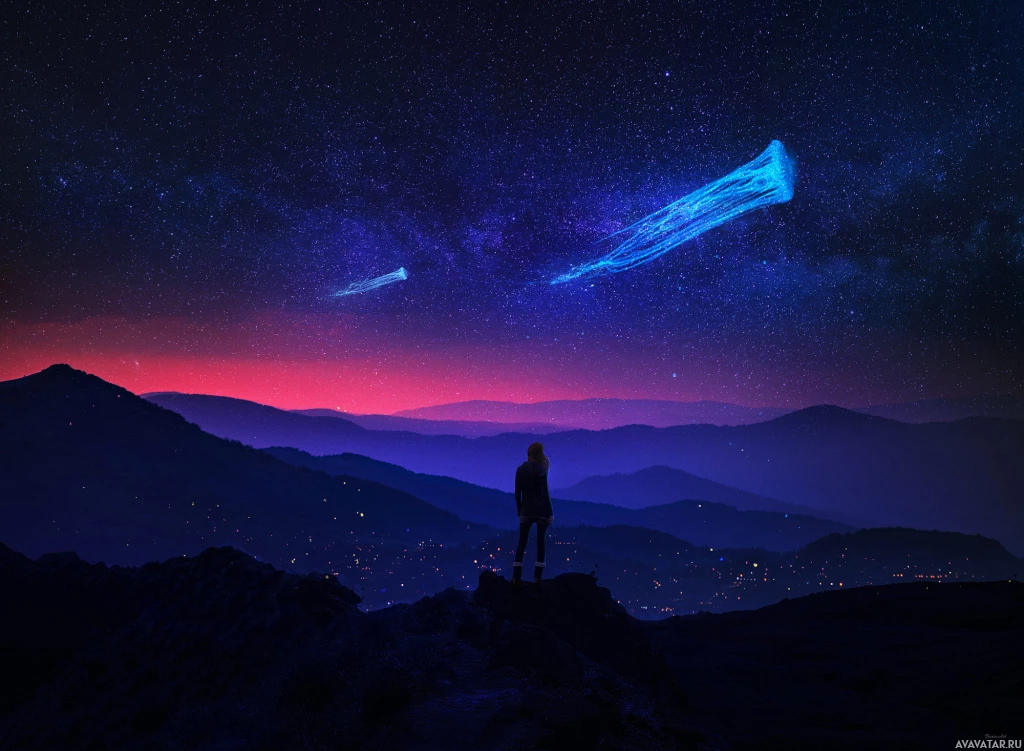 the cosmic display, with their back to us. This scene captures the serenity and wonder of observing the night sky, particularly during meteor showers and comet events.