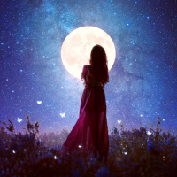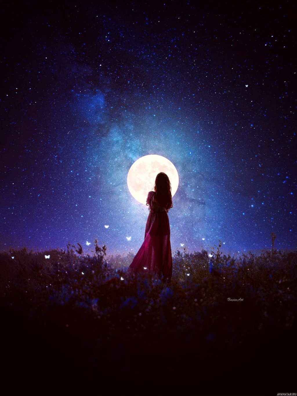 a full moon shining brightly over the landscape, which appears to be a starry night with a galaxy view in the distance. The overall atmosphere of the image is serene and contemplative.