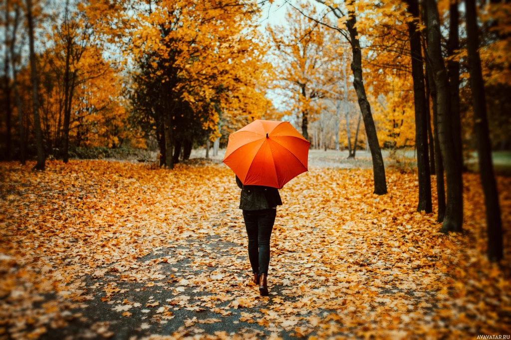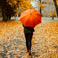 fall foliage, suggesting it might be mid-to-late October or early November in a location with seasonal changes. Behind the individual, there's an umbrella open, indicating that it may be raining or drizzling. The person is walking away from the camera, and we can see their back as they move along the path. The overall atmosphere of the photo captures a peaceful autumn scene with the contrast between the colorful