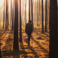 На картинке изображен человек, идущий по лесу, сквозь который проникает солнечный свет, создавая длинные тени на земле. Это силуэт человека сзади, создающий ощущение одиночества и спокойствия. Нет никаких указаний на то, что на снимке изображена именно девушка.
