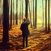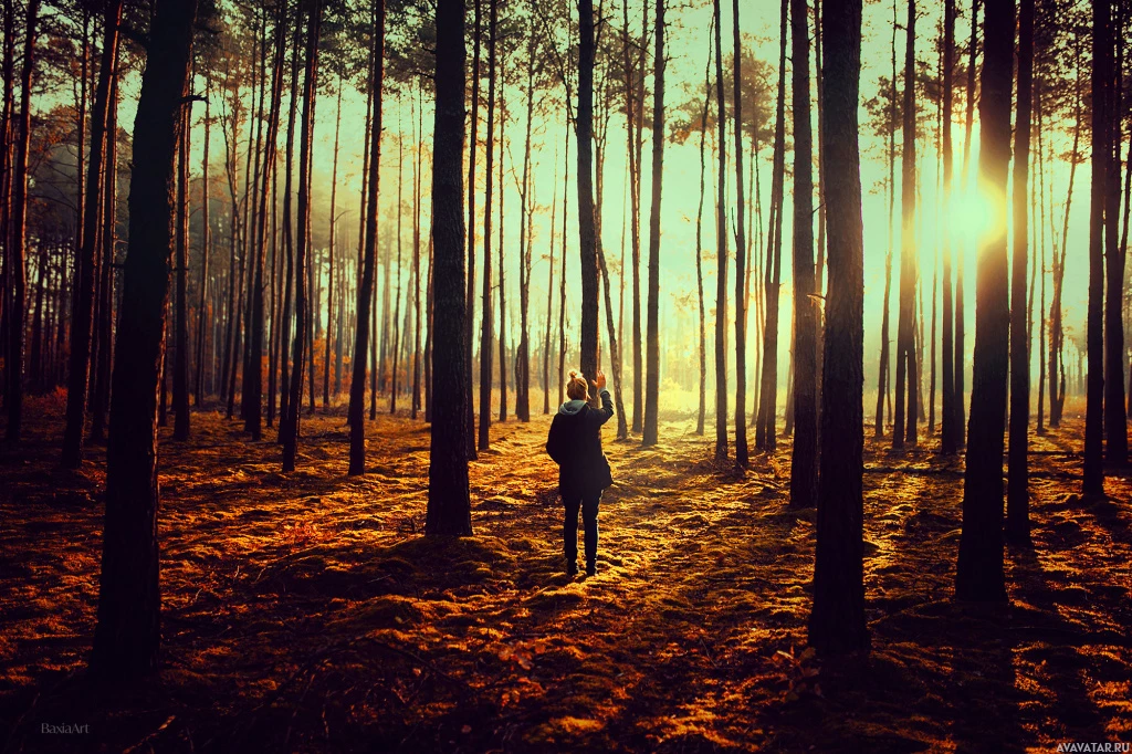 tall trees. There is a person walking along a path, and another person sitting on the ground to their right. The sunlight filters through the canopy overhead, casting