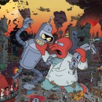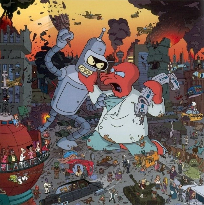 the main characters: Bender, who is an alcoholic robot, and Zoidberg, a mutant lobster. They are engaged in a heated confrontation within