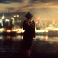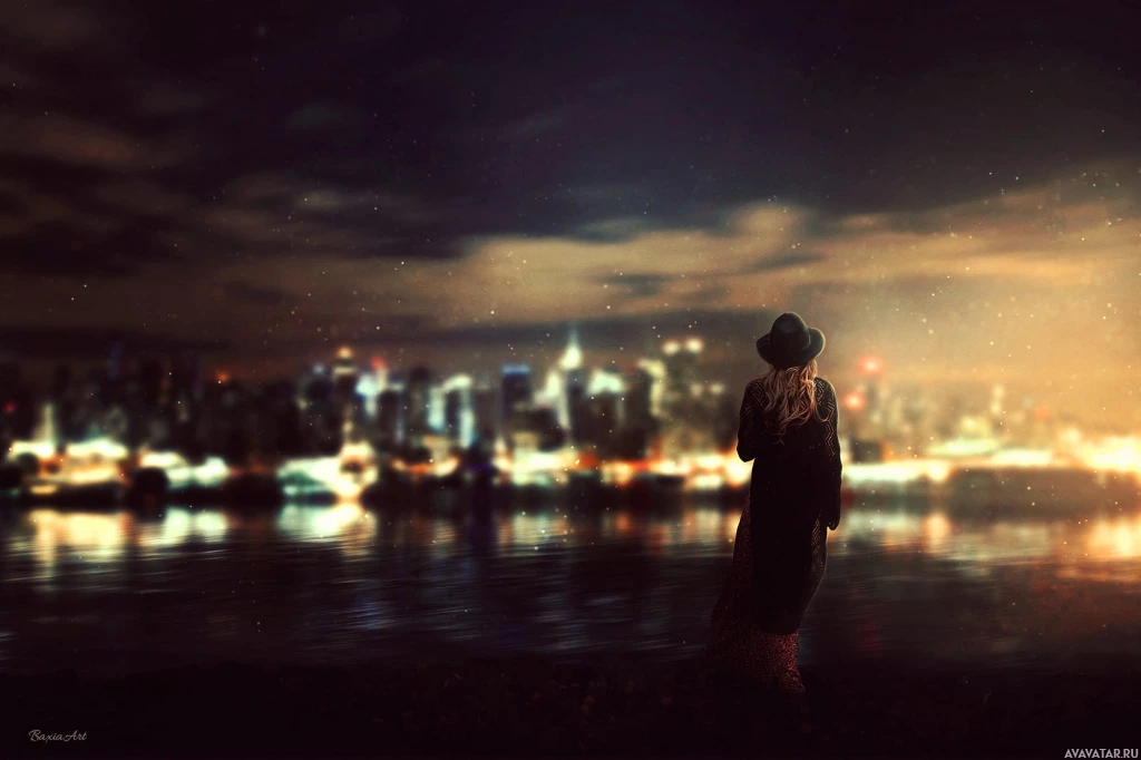 На картинке изображен человек, стоящий ночью у кромки воды. На нем, судя по всему, надета шляпа, и он повернут лицом в сторону камеры, глядя вдаль, на городской пейзаж. На воде также видна лодка, которая дополняет городскую атмосферу этого места.
