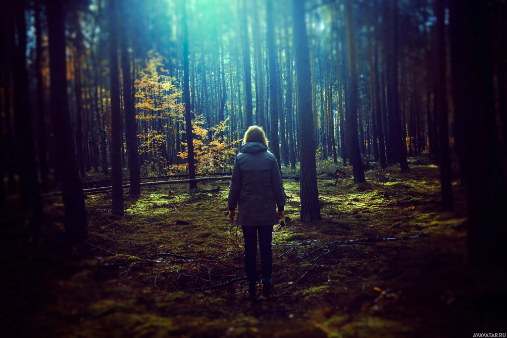 The image shows a person walking through what appears to be a dense forest, likely during a time of day when the sunlight filters through the canopy and creates an ethereal glow on the moss-
