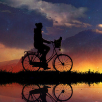 a silhouette of a person riding a bicycle. The setting appears to be a tranquil and serene environment, possibly at sunrise or sunset given