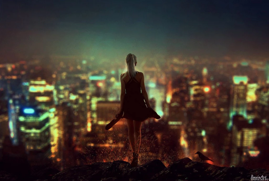 a sense of solitude and perhaps introspection in her posture. The atmosphere is moody and dramatic, with the contrast between the bright cityscape and the darkness adding to