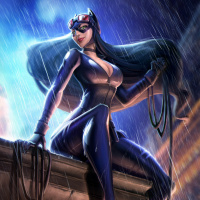 iconic costume, which includes a black bodysuit, cat ears, and a tail. Her hands are holding a whip, and she has a pistol holstered on her thigh. She is positioned in