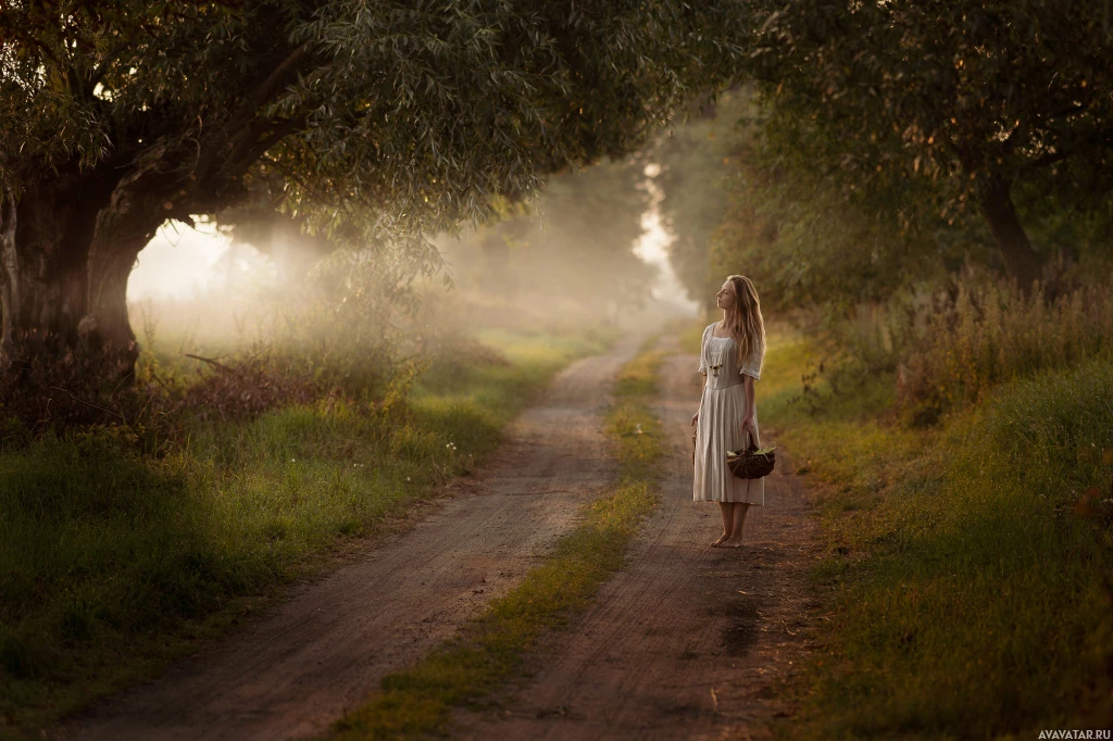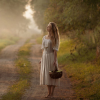 a rural road. She is wearing a long, flowing dress that reaches to her ankles and appears to be made of