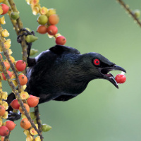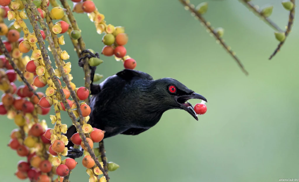 a black bird, which appears to be a bird of the Corvidae family, possibly a crow. It is holding a fruit in its beak and seems to be enjoying it. The background suggests