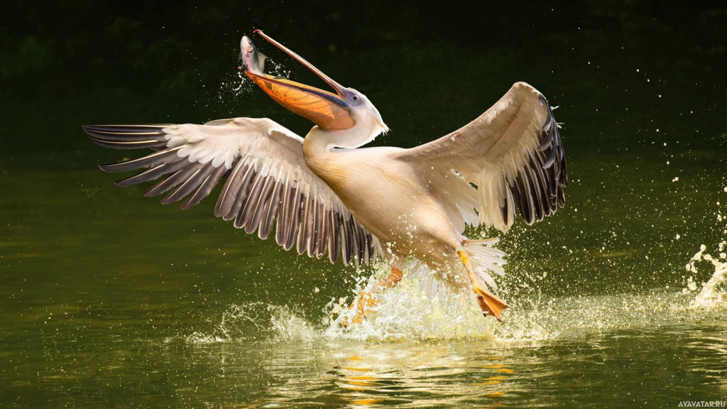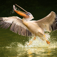 the splash of water beneath it. The bird's wings are spread wide, and its feathers are ruffled, suggesting movement. Its