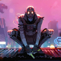 an urban environment at night, with neon signs and futuristic elements such as hover vehicles. The robot is centrally positioned in the foreground, portrayed in
