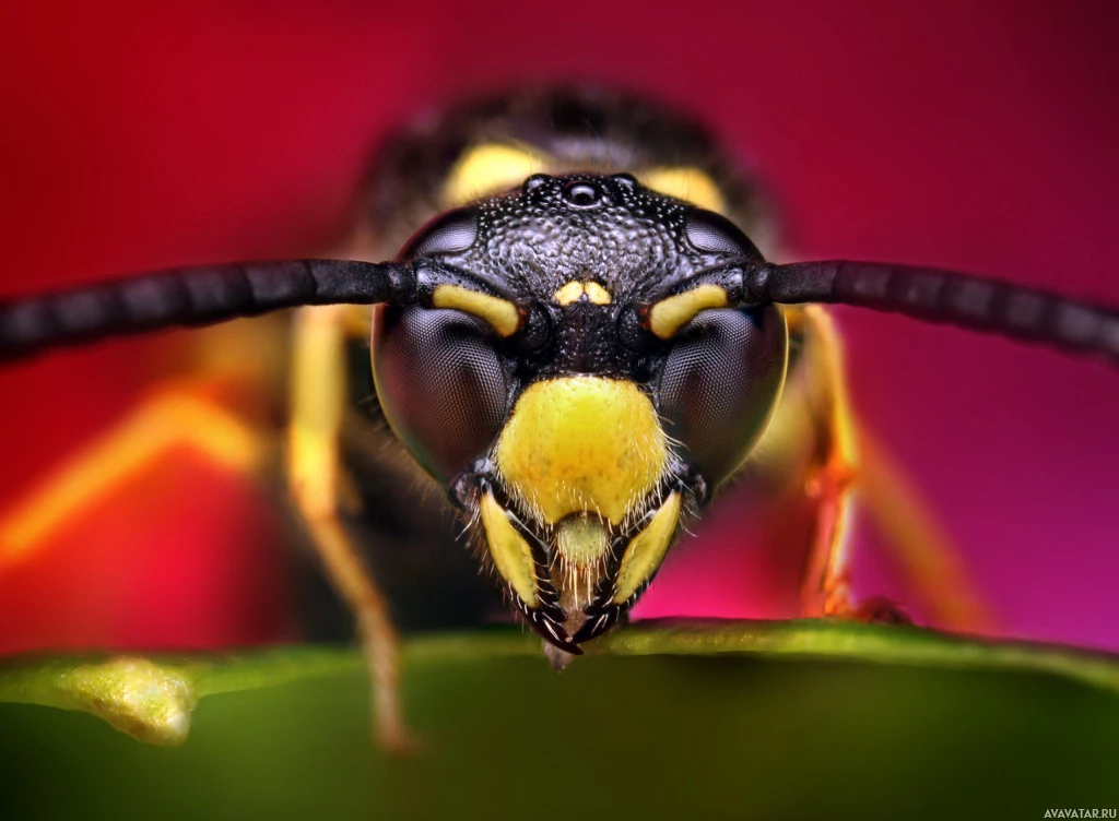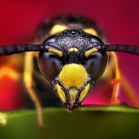 distinctive markings with black and yellow stripes, which is characteristic of the species. The wasp appears to be perched on a surface, possibly a leaf or a flower petal, as suggested by