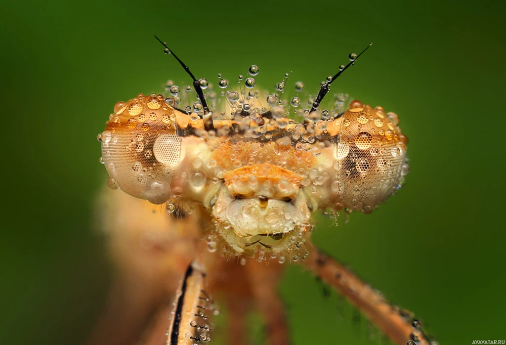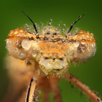 droplets of water on its body and wings, indicating it may have recently been in contact with the water. The dragonfly appears to be looking directly at the camera or something in front of it. This is an example of a macro photograph that captures the details of an insect's features in close-up.