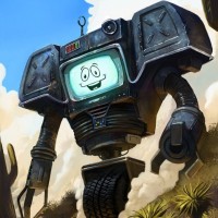 The image features a stylized robot character with a humorous and cartoonish design, reminiscent of those found in