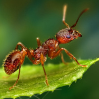 The image shows an ant perched on a leaf. It is a close-up photograph focusing on the insect, capturing its small size and intricate details. Ants are known for their social behavior and various roles within a colony.