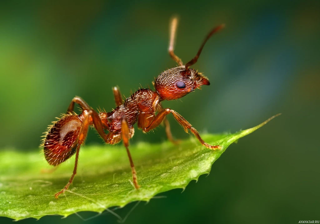 На картинке изображен муравей, сидящий на листе. Это фотография насекомого крупным планом, на которой запечатлены его небольшие размеры и сложные детали. Муравьи известны своим социальным поведением и различными ролями в колонии.