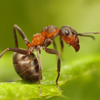 The image shows a small insect, which is an ant. It appears to be walking on a leafy surface, possibly feeding or moving around. This type of ant can commonly be found in various environments, including gardens and forests.