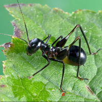 The picture shows an insect, which appears to be a black and yellow-striped bug. This could potentially be a type of katydid or another insect with similar