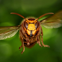 The picture shows a bee flying close to the camera, which captures its details well. Bees are insects and play an important role in pollination for plants. They belong to the animal kingdom as they are living creatures.