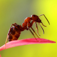 The image shows an ant hanging from a leaf, which is a common behavior for ants to get around. This is the type of behavior that can be observed in insects like ants.