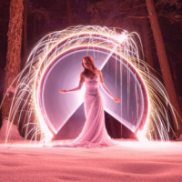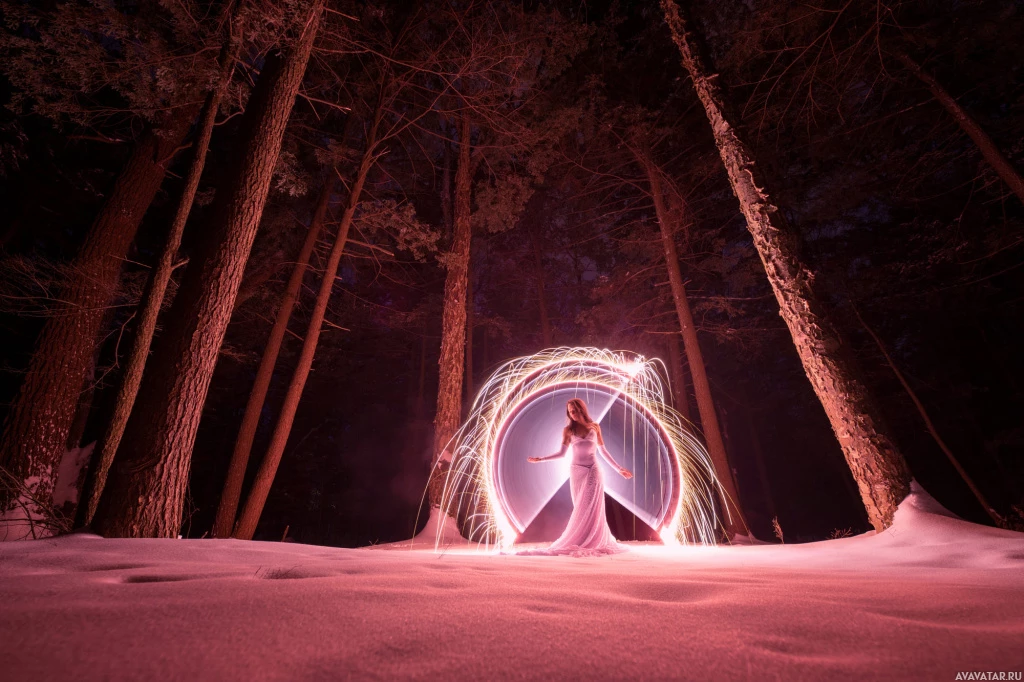 a white dress, standing in the middle of a snowy forest. She is surrounded by
