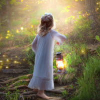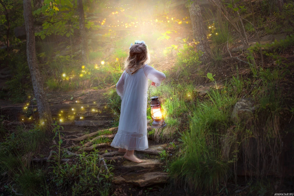 a young girl standing on what appears to be a stairway or path in a wooded area. She is dressed in a white gown and holding a lantern in her hand, which suggests she may be engaging in