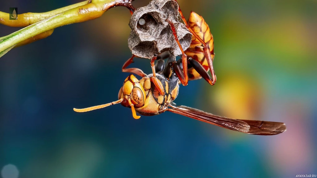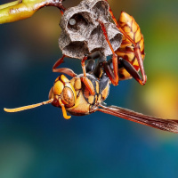 a dynamic pose with its wings open, likely either preparing to fly or having just landed on the surface it's perched on. The background is blurred but gives off a colorful and possibly natural setting that could suggest this photo was taken outdoors. Bees are known for their