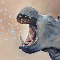 The image shows an artistic representation of a hippopotamus. The hippo appears to be opening its mouth wide as if shouting or yelling, with its teeth visible and tongue sticking out. There are bubbles around the mouth, suggesting that it could be spitting something out or perhaps breathing air from a tank. The background is neutral-toned, which helps emphasize the hippo in the foreground.