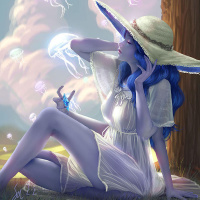 a mystical figure within the game's universe. The background features a whimsical sky with fluffy clouds and what looks like a rainbow, adding to